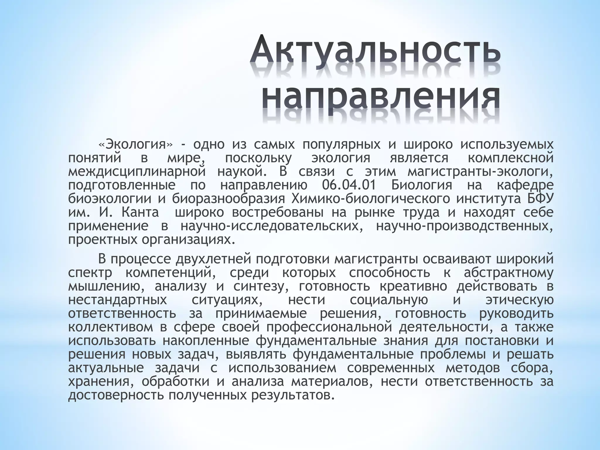 Документ описывает образовательную программу по экологии на кафедре биоэкологии и биоразнообразия, акцентируя внимание на востребованности магистрантов на рынке труда и широком наборе изучаемых компетенций. Основные курсы включают современные методы в экологии и урбоэкологии, что обеспечивает подготовку специалистов, способных решать актуальные экологические проблемы. Также перечислены лаборатории и организации, где выпускники находят применение своих знаний после завершения обучения.