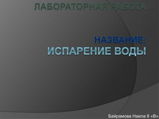 Документ описывает исследование влияния различных факторов на скорость испарения жидкости с использованием майок разных размеров и материалов. В ходе экспериментов установлено, что скорость испарения зависит от площади поверхности, температуры окружающей среды, рода вещества и потоков воздуха. Общий вывод подтверждает, что скорость испарения увеличивается при больших площадях, высоких температурах, легких молекулах и ежели имеются сильные воздушные потоки.