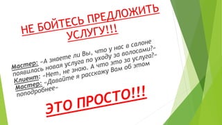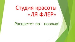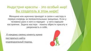 Документ описывает принципы работы и стандарты внешнего вида для мастеров студии красоты «Ля Флер». Он подчеркивает важность положительных эмоций клиента и индивидуального подхода, а также предлагает методы обеспечения качества обслуживания и улучшения работы салона. Включены рекомендации по поддержанию порядка на рабочем месте, ведению онлайн-присутствия и обновлению ценовых предложений.