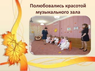 В осеннем утреннике групп 'Радуга' и 'Лучики' под руководством музыкального руководителя Светланы Александровны и воспитателей состоялись различные мероприятия: песни, кукольный театр и танцы с листочками. Дети читали стихи об осени и получили угощение от зайцев. Мероприятие прошло в музыкальном зале, где ребята насладились атмосферой осени.