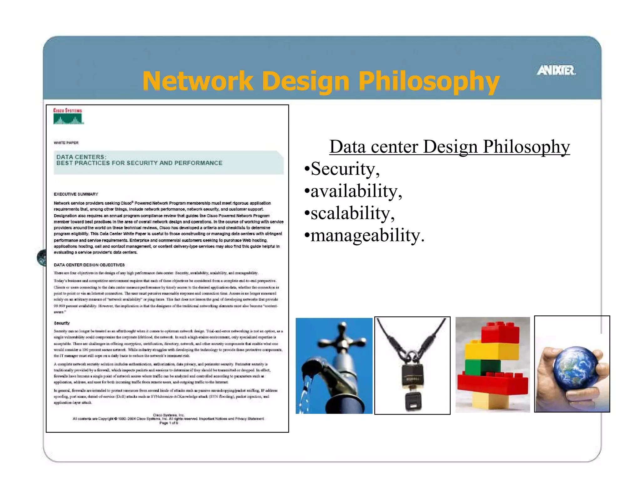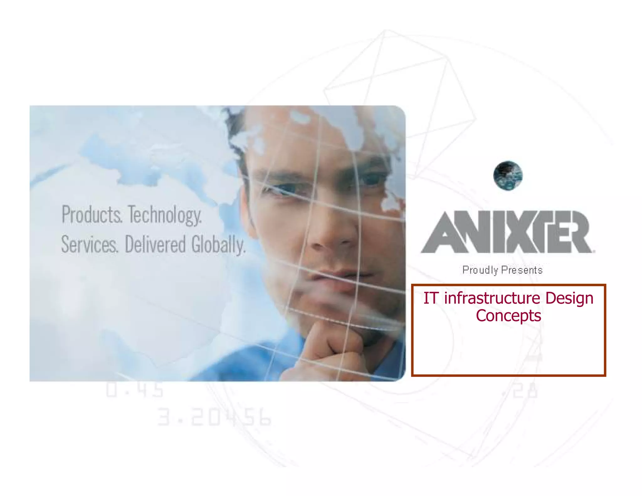 The document discusses concepts for designing an IT infrastructure network. It emphasizes security, availability, scalability, and manageability. It recommends 10 Gigabit Ethernet and single-mode fiber cabling to support current and future needs. Pre-terminated cabling systems and angled patch panels are proposed to improve deployment speed, maximize density, and simplify management. An intelligent cabling system integrated with network monitoring is suggested to provide complete physical and logical visibility of the network.