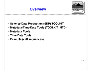 The document describes the Toolkit_MTD package, which contains tools extracted from the larger Science Data Processing (SDP) Toolkit. Toolkit_MTD allows extended data providers to format products in Earth Observing System (EOS) standard formats without requiring the full SDP Toolkit. It contains tools for working with metadata and converting between time/date formats. Examples demonstrate initializing metadata files, setting attribute values, and writing metadata to HDF and ASCII files.