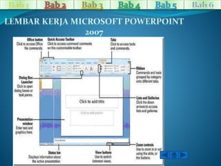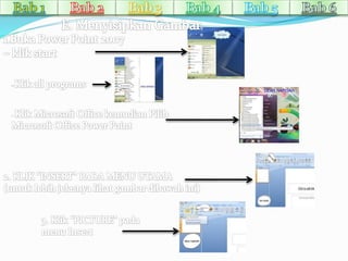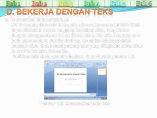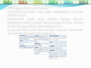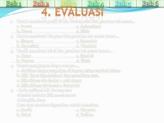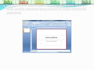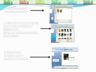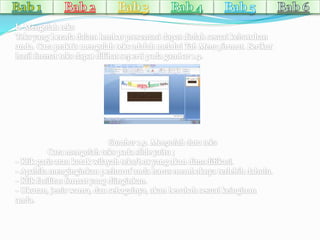 BAB 4 membahas tentang menambahkan animasi pada slide presentasi PowerPoint. Terdapat empat jenis efek animasi yaitu entrance, emphasis, exit, dan motion path. Animasi dapat diatur kecepatan dan arah geraknya. Presentasi dapat diatur animasinya untuk berjalan secara otomatis maupun pada klik mouse. Efek transisi slide juga dapat ditambahkan untuk menambah kesan saat berganti slide.