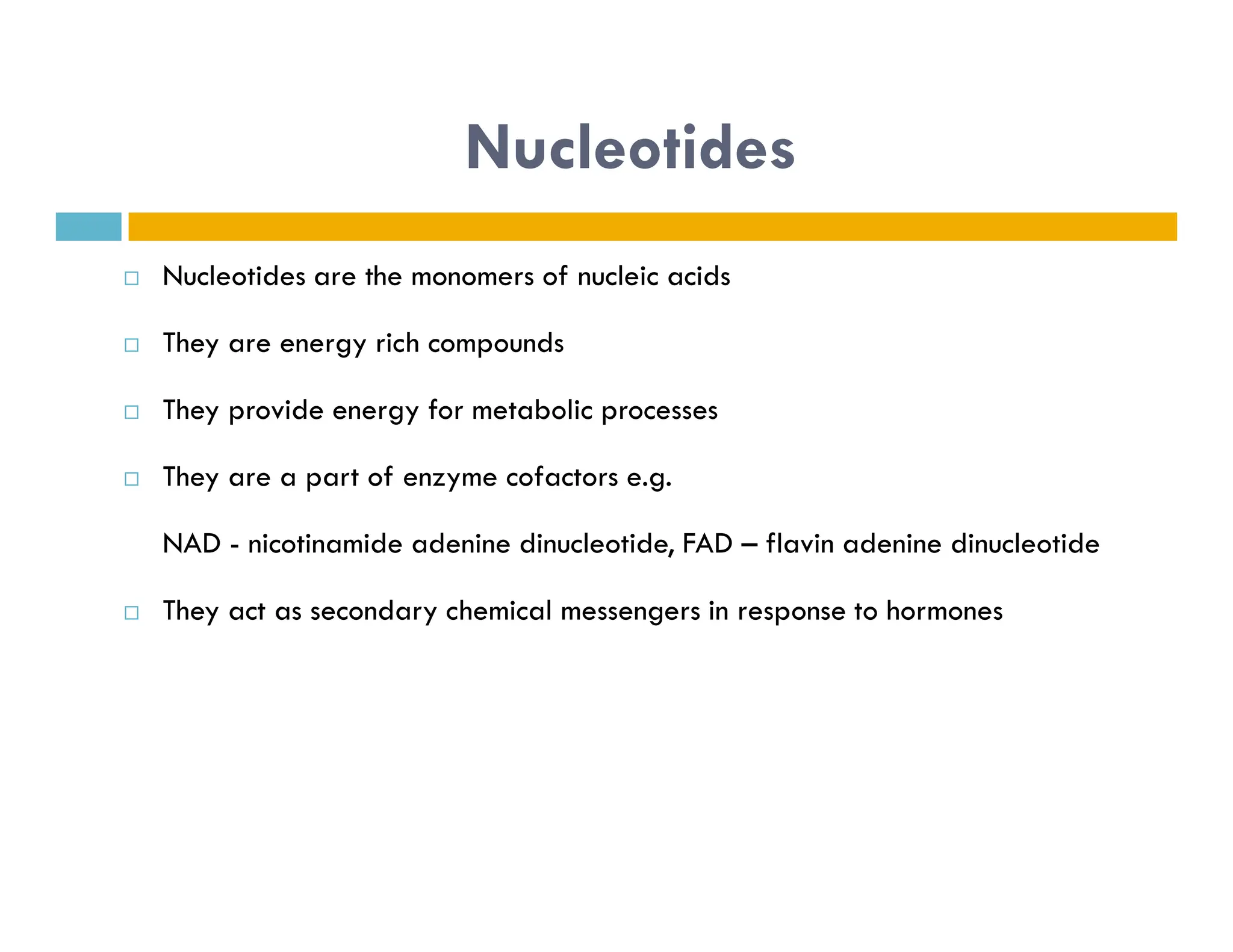 Nucleotides are monomers that make up nucleic acids like DNA and RNA. They consist of a nitrogenous base, a 5-carbon sugar (either deoxyribose or ribose), and phosphate groups. Nucleotides act as energy carriers in cells and are components of coenzymes. There are two main types of nucleic acids: DNA contains the genetic blueprint and is located in the nucleus, while RNA assists in decoding this information and protein synthesis. Both nucleic acids have specific structures like the DNA double helix formed by base pairing between nucleotides on complementary strands.