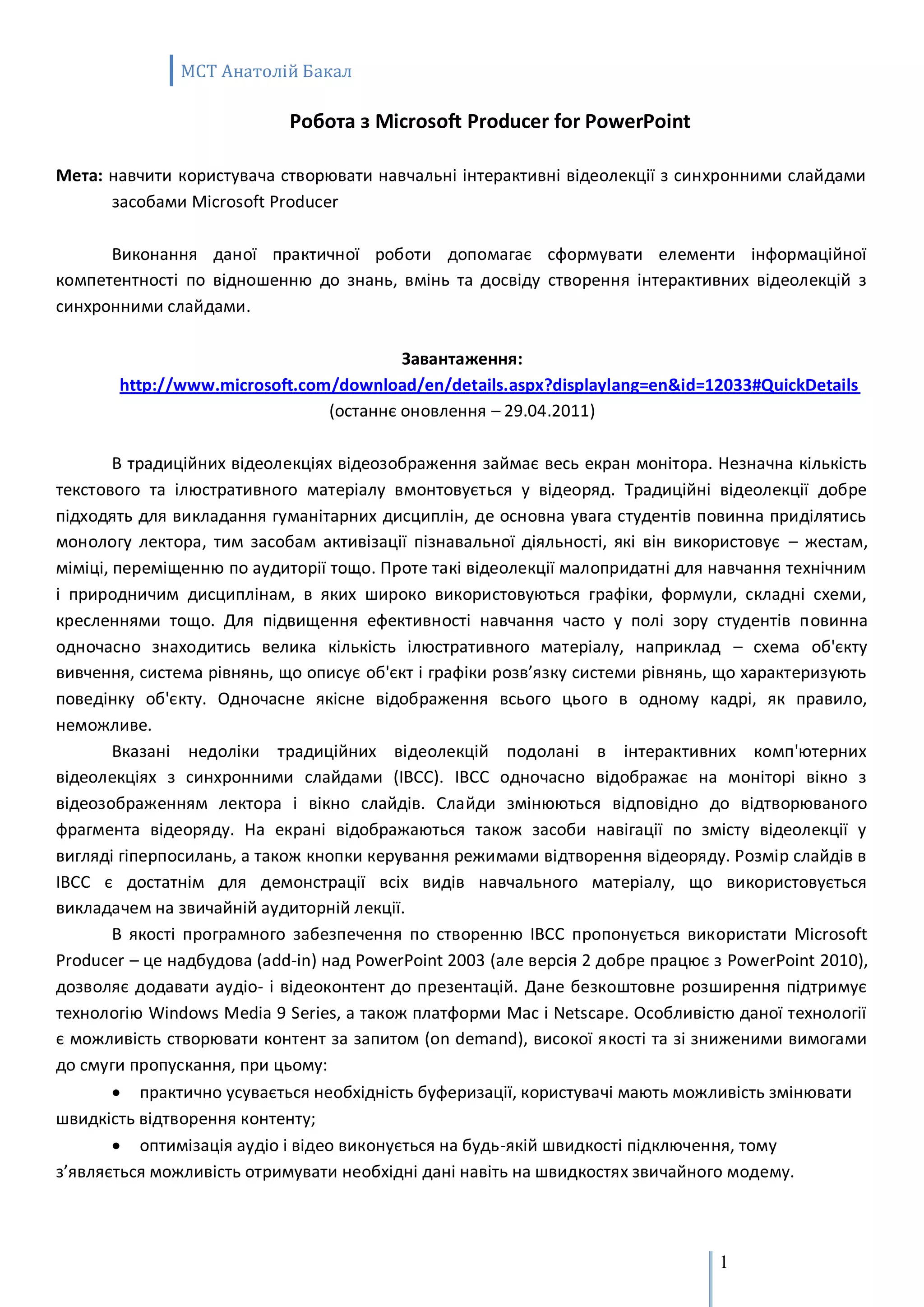Мета: навчити користувача створювати навчальні інтерактивні відеолекції з синхронними слайдами засобами Microsoft Producer