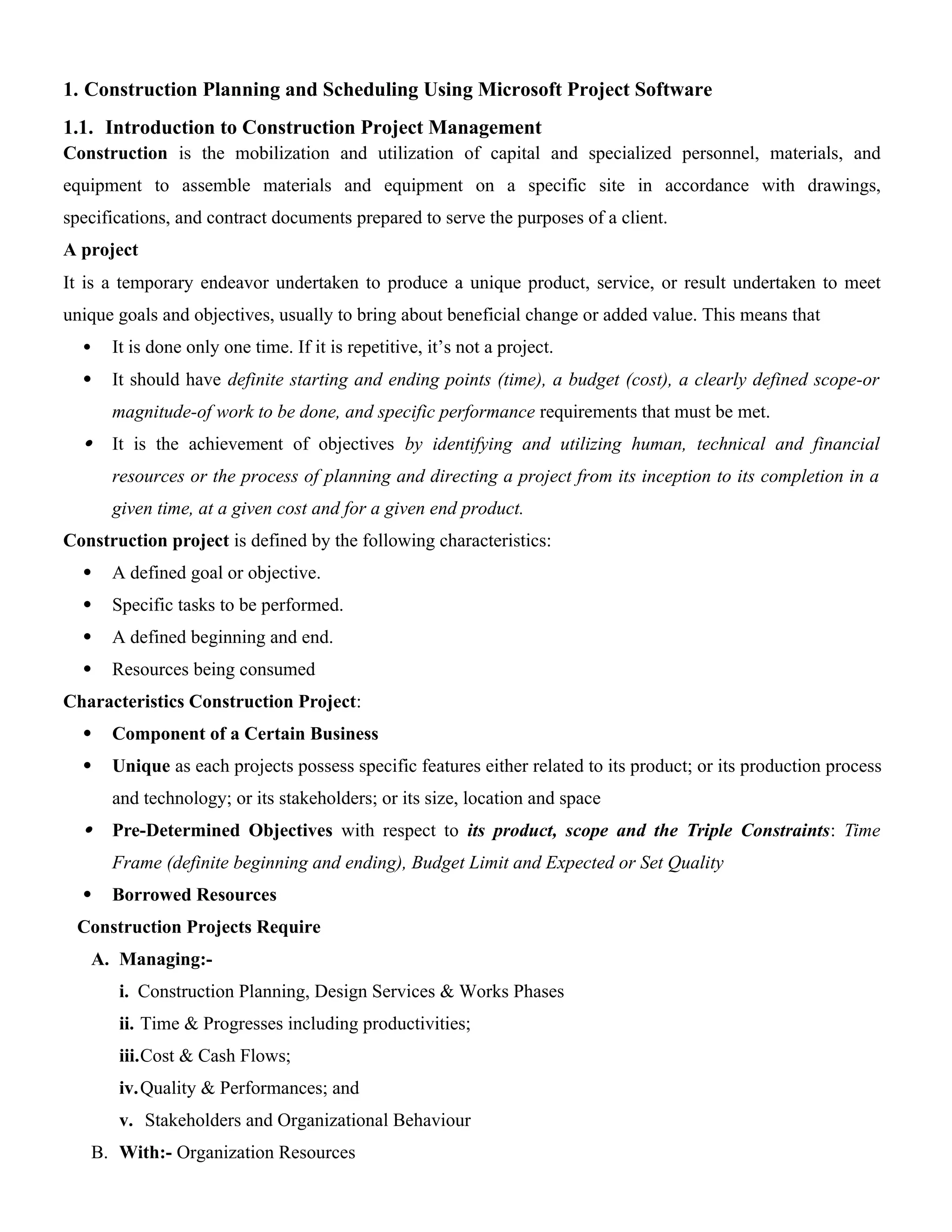 The document provides a comprehensive overview of construction project management and the use of Microsoft Project software for planning and scheduling. It outlines key concepts such as project characteristics, management processes, and the critical role of various factors like cost, time, and human resources in successful project execution. Additionally, it details the functionalities of Microsoft Project software, including scheduling, resource management, and budget tracking, along with practical steps for creating and managing a project schedule.