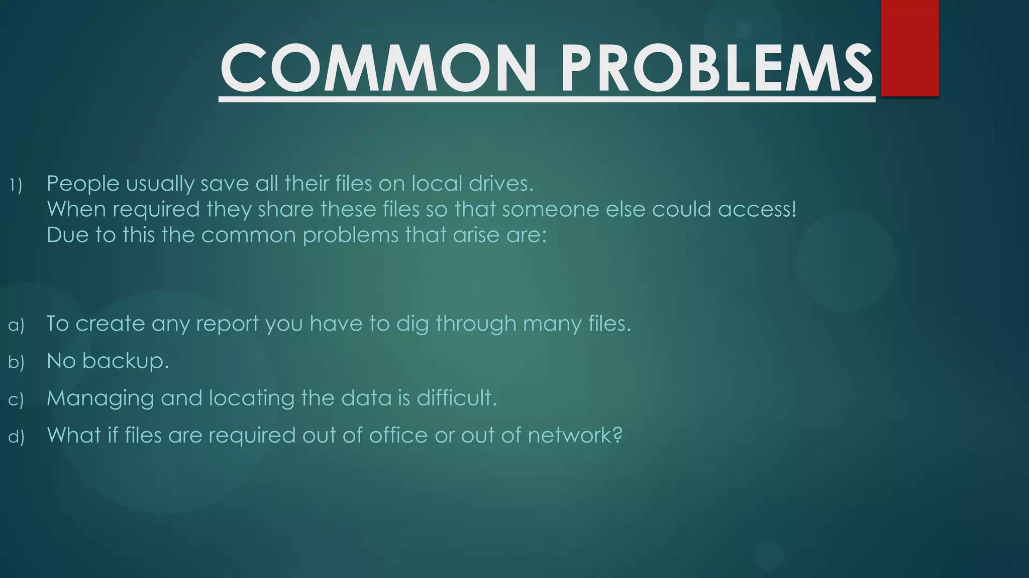 The document discusses common problems faced by individuals when managing files locally and using paper for reports, leading to inefficiencies and lack of data backup. It presents Microsoft SharePoint as a solution to these issues by providing a web-based platform for data management, document sharing, and project tracking. SharePoint offers various functionalities including sharing, organizing, discovering, building, and managing information effectively within organizations.