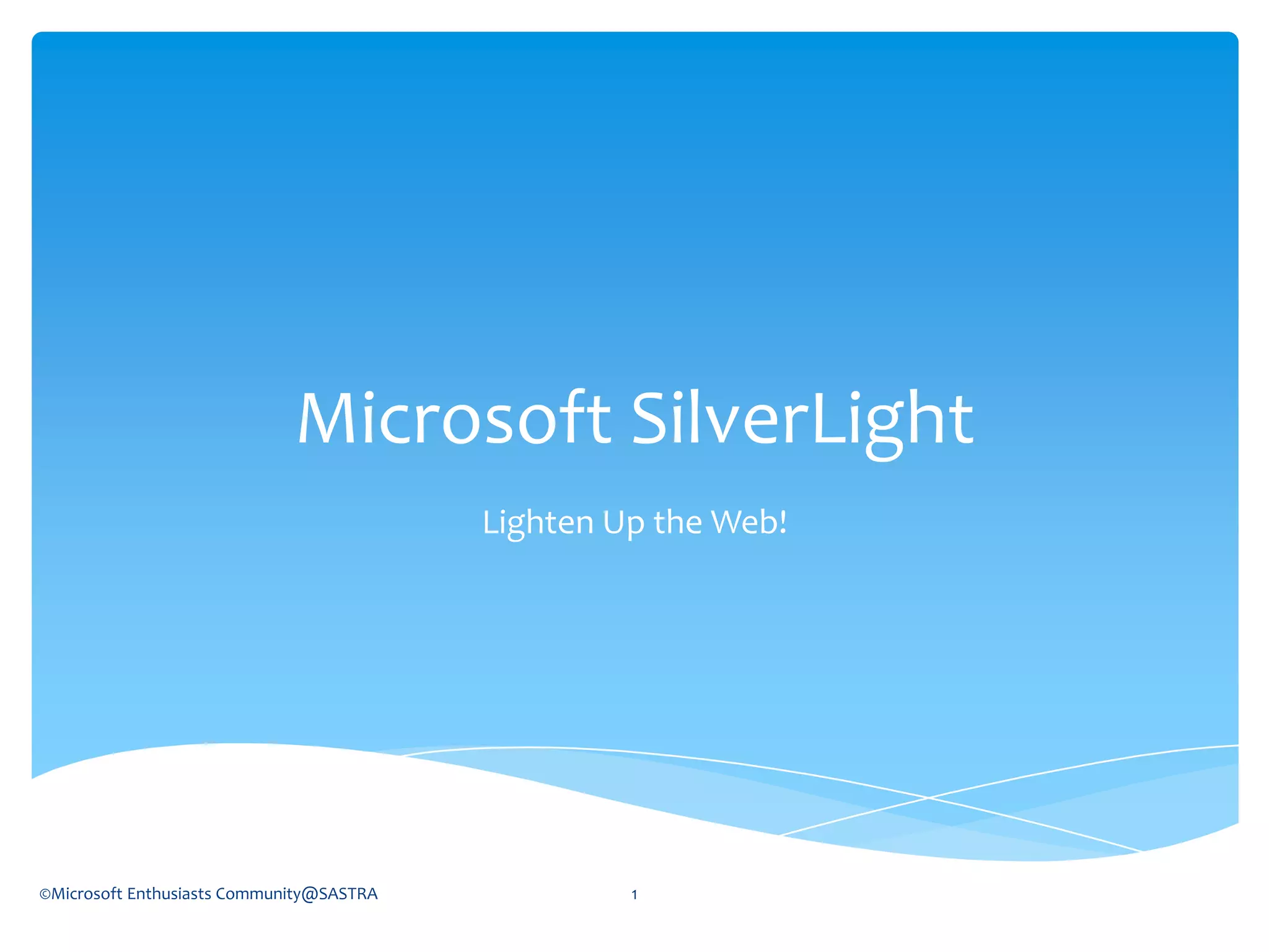 Silverlight is a web application framework developed by Microsoft for web applications and multimedia. It provides functionality similar to Adobe Flash, allowing for rich multimedia and animation on the web. Silverlight supports features like media streaming, deep zoom, animations, webcam support, and drag and drop. It also allows for engaging applications to be built and experienced outside the browser. Silverlight sees growing use on websites for sports, entertainment, and banking as more devices connect to the internet.