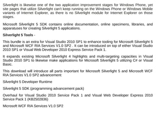 The document discusses Microsoft Silverlight 5, detailing its features and improvements over previous versions. Key enhancements include various click count detection, troubleshooting for XAML code, rich 3D API access, low-latency sound effects, and improved execution performance. Additionally, it emphasizes better support for RIA services, text and printing, and out-of-browser applications, while inviting readers to explore further in related articles.