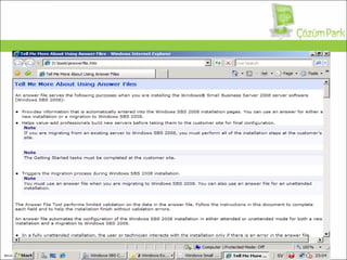 Migration -Kurulum SBS2008 ‘i unattended dosya kullanarak yükleyin Network ile ilgili gerekli bilgiyi toplayın DVD içindeki SBSAfg dosyasını çalıştırın SBSAfg sihirbazı ile oluşturacağınız dosyayı ”sbsanswerfile.xml” olarak kaydedin Usb disk ya da cd gibi bir taşınabilir depolama aygıtına kopyalayın