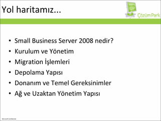 Yol haritamız... SmallBusiness Server 2008 nedir? Kurulum ve Yönetim Migration İşlemleri Depolama Yapısı Donanım ve Temel Gereksinimler Ağ ve Uzaktan Yönetim Yapısı