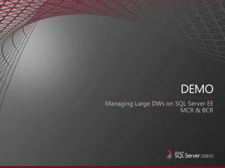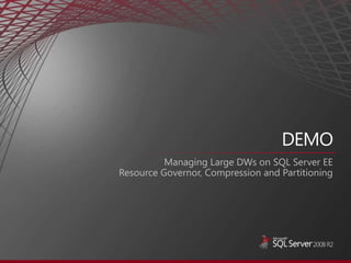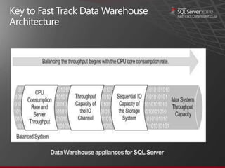 The document discusses Microsoft SQL Server data warehousing solutions. It provides an agenda for a presentation that includes an overview of Microsoft's data warehousing offerings, how to establish baseline metrics for Fast Track reference configurations, and how to design balanced server and storage configurations for data warehousing workloads. It also discusses software and hardware best practices, such as data striping and storage configuration recommendations. Overall, the document outlines topics and solutions to help customers accelerate their data warehouse deployments using Microsoft SQL Server.