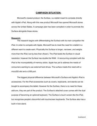 This document provides a campaign plan to promote Microsoft's new Surface tablet and Microsoft stores. The plan includes research on the Surface and its main competitor the iPad, key messages focusing on exclusivity, objectives to promote the Surface and stores, and tactics like media outreach, giveaways, and an in-store launch event. The target audience is professionals aged 35-50 with the goal of presenting the Surface as a competitor to the iPad and drawing people to Microsoft stores in the short and long term.