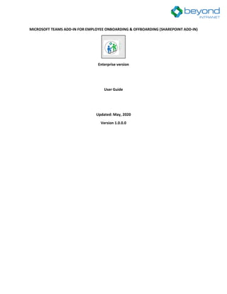 The document is a user guide for the Microsoft Teams add-in for employee onboarding and offboarding, aimed at enterprise users. It provides detailed steps for installing and configuring the add-in in SharePoint and integrating it into Microsoft Teams. Additionally, it covers various functionalities such as task management, filtering options, and notifications for team members.