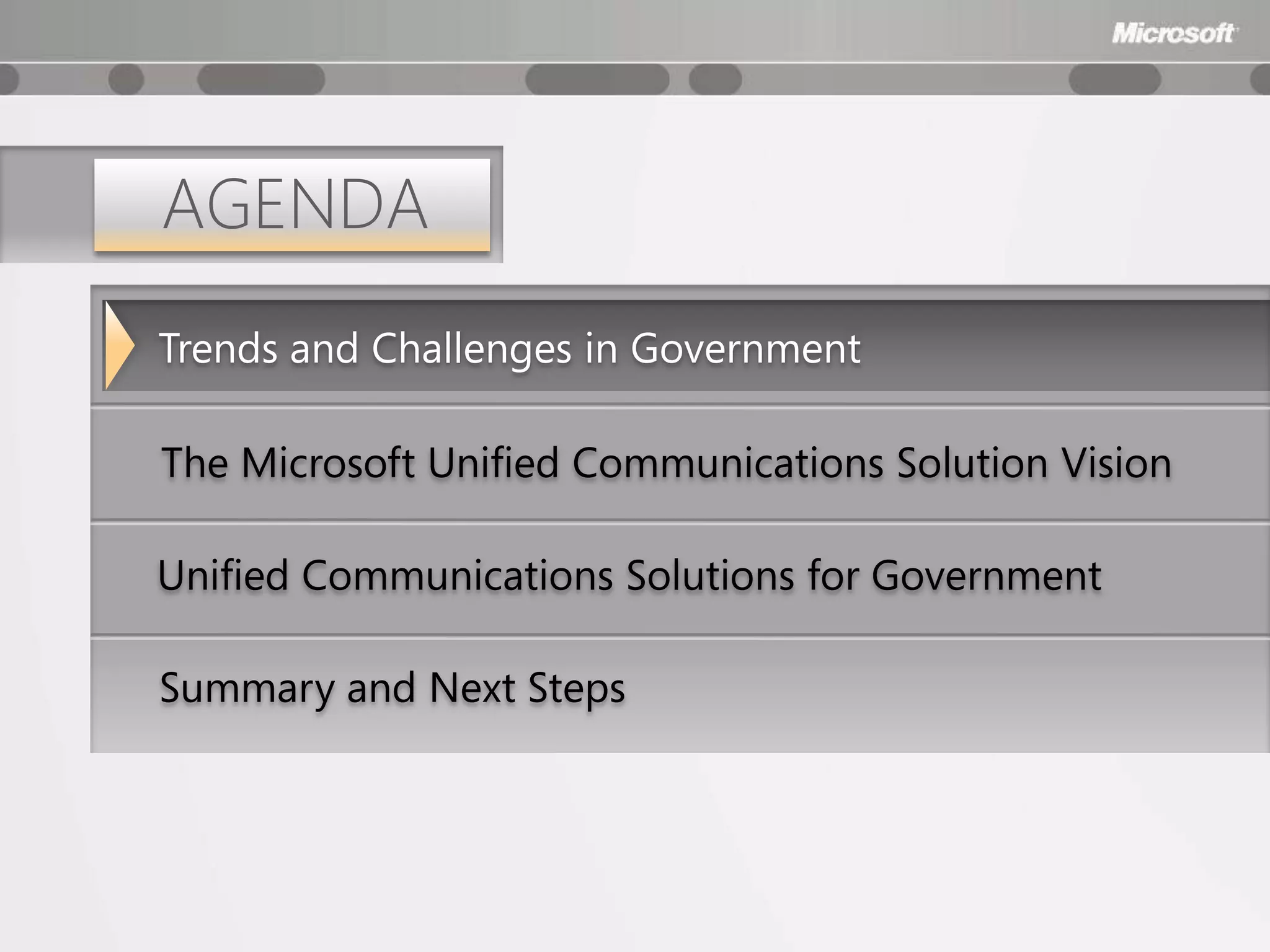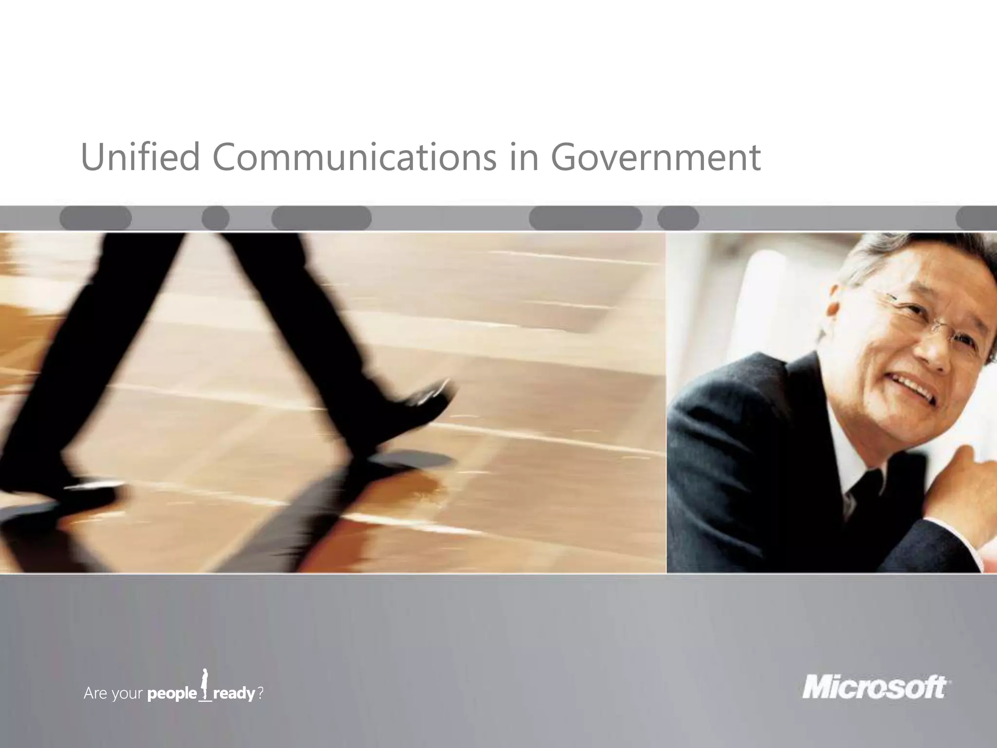The document discusses unified communications solutions for government. It outlines key trends such as improving service delivery, environmental sustainability, and cost efficiency. It also discusses challenges like lack of self-service systems and high communications costs. The document describes Microsoft's unified communications vision and solutions that can help governments address trends and challenges through improved productivity, efficient operations, and enhanced situational awareness, emergency response, and operational readiness.
