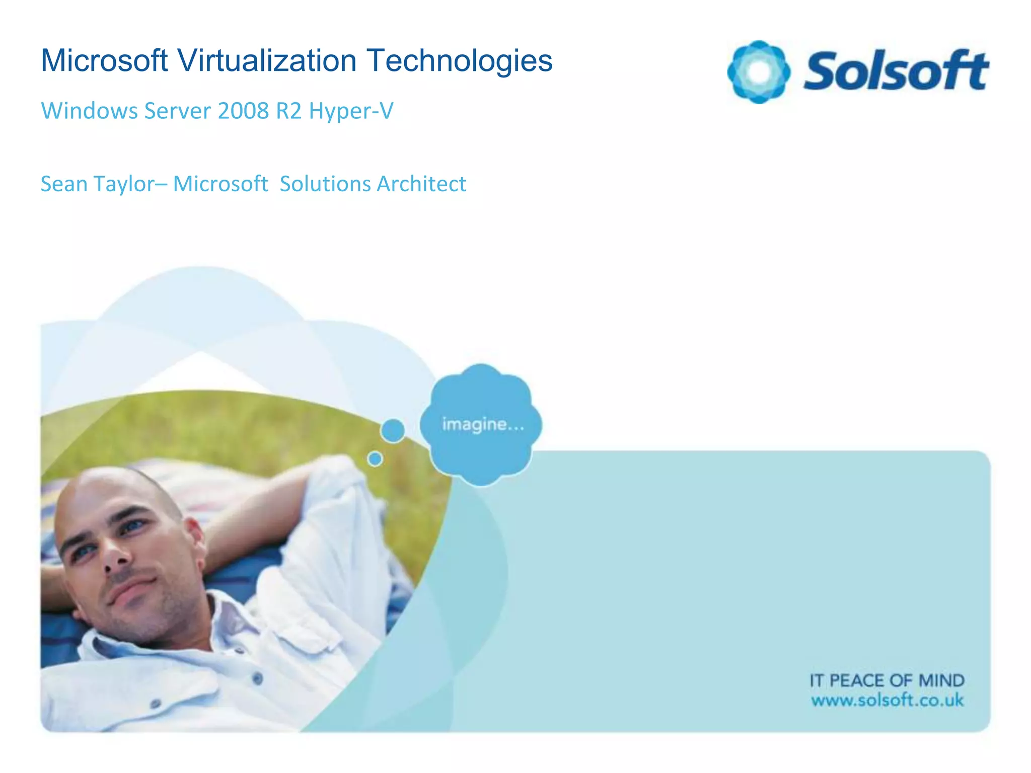 The document details Microsoft's virtualization technologies, specifically focusing on Windows Server 2008 R2 Hyper-V, which enables virtualization and server consolidation. It outlines features such as live migration, dynamic memory, and core parking, as well as management tools like System Center for efficient operations. The document also discusses licensing options, deployment architectures, and high-availability configurations for enterprises utilizing Hyper-V.