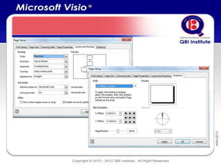 This presentation discusses Microsoft Visio and how it can be used to create diagrams and flowcharts. It covers topics such as the Visio interface, shapes, connectors, themes, and preparing UML diagrams. Templates and stencils can be used to insert pre-made shapes. Contextual tabs appear when relevant tools are needed. Pages can be inserted, deleted, and reordered.