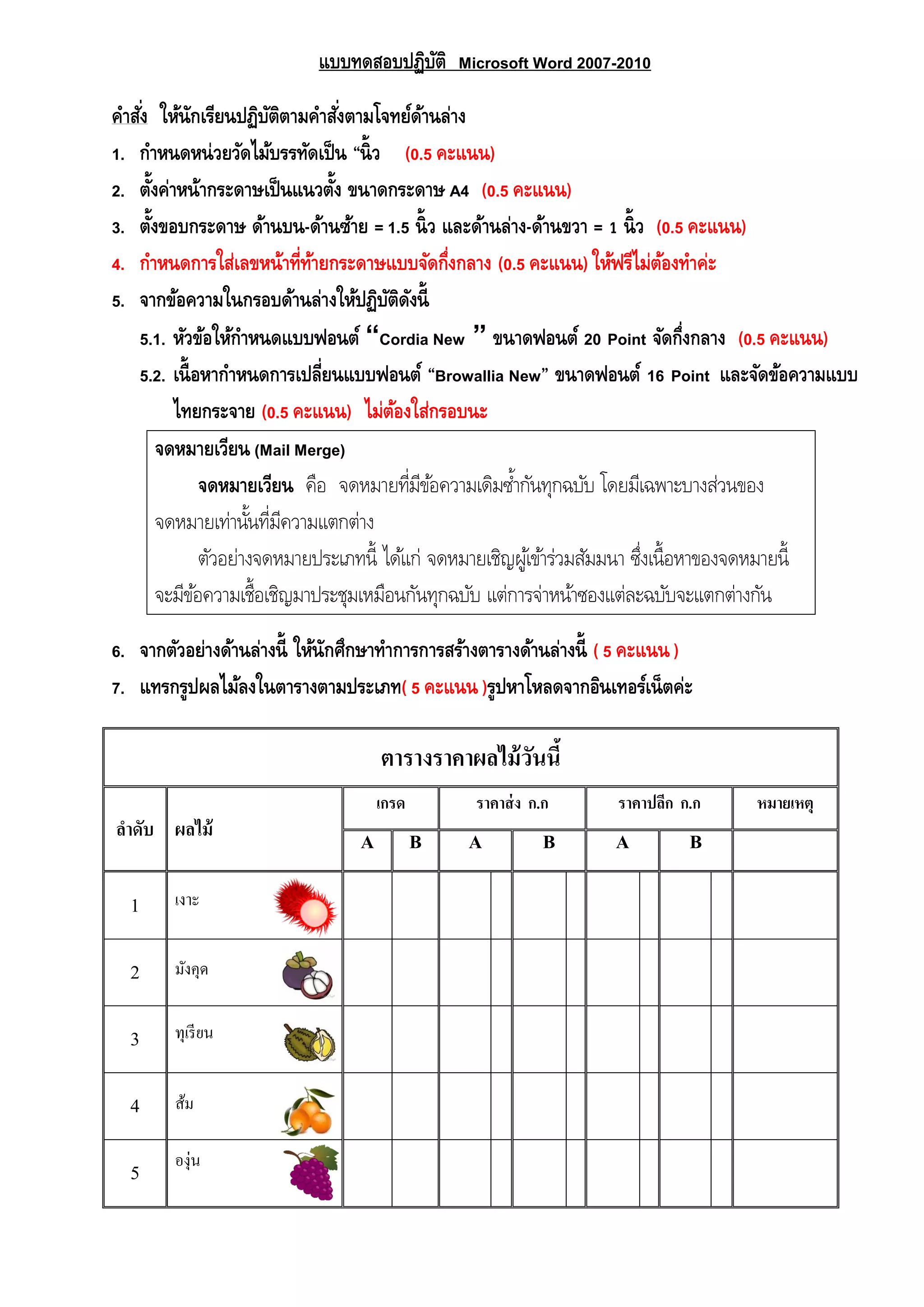 2007-2010 คาสั่ง ให้นักเรียนปฏิบัติตามคาสั่งตามโจทย์ด้านล่าง 1. กาหนดหน่วยวัดไม้บรรทัดเป็น “นิ้ว (0.5 คะแนน) 2. ตั้งค่าหน้ากระดาษเป็นแนวตั้ง ขนาดกระดาษ A4 (0.5 คะแนน) 3. ตั้งขอบกระดาษ ด้านบน-ด้านซ้าย = 1.5 นิ้ว และด้านล่าง-ด้านขวา = 1 นิ้ว (0.5 คะแนน) 4. กาหนดการใส่เลขหน้าที่ท้ายกระดาษแบบจัดกึ่งกลาง (0.5 คะแนน) ให้ฟรีไม่ต้องทาค่ะ 5. จากข้อความในกรอบด้านล่างให้ปฏิบัติดังนี้ 5.1. หัวข้อให้กาหนดแบบฟอนต์ “Cordia New ” ขนาดฟอนต์ 20 Point จัดกึ่งกลาง (0.5 คะแนน) 5.2. เนื้อหากาหนดการเปลี่ยนแบบฟอนต์ “Browallia New” ขนาดฟอนต์ 16 Point และจัดข้อความแบบ ไทยกระจาย (0.5 คะแนน) ไม่ต้องใส่กรอบนะ จดหมายเวียน (Mail Merge) จดหมายเวียน คือ จดหมายที่มีข้อความเดิมซ้ากันทุกฉบับ โดยมีเฉพาะบางส่วนของ จดหมายเท่านั้นที่มีความแตกต่าง ตัวอย่างจดหมายประเภทนี้ ได้แก่ จดหมายเชิญผู้เข้าร่วมสัมมนา ซึ่งเนื้อหาของจดหมายนี้ จะมีข้อความเชื้อเชิญมาประชุมเหมือนกันทุกฉบับ แต่การจ่าหน้าซองแต่ละฉบับจะแตกต่างกัน 6. จากตัวอย่างด้านล่างนี้ ให้นักศึกษาทาการการสร้างตารางด้านล่างนี้ ( 5 คะแนน) 7. แทรกรูปผลไม้ลงในตารางตามประเภท( 5 คะแนน )รูปหาโหลดจากอินเทอร์เน็ตค่ะ ตารางราคาผลไม้วันนี้ ลาดับ ผลไม้ เกรด ราคาส่ง ก.ก ราคาปลีก ก.ก หมายเหตุ A B A B A B 1 เงาะ 2 มังคุด 3 ทุเรียน 4 ส้ม 5 องุ่น