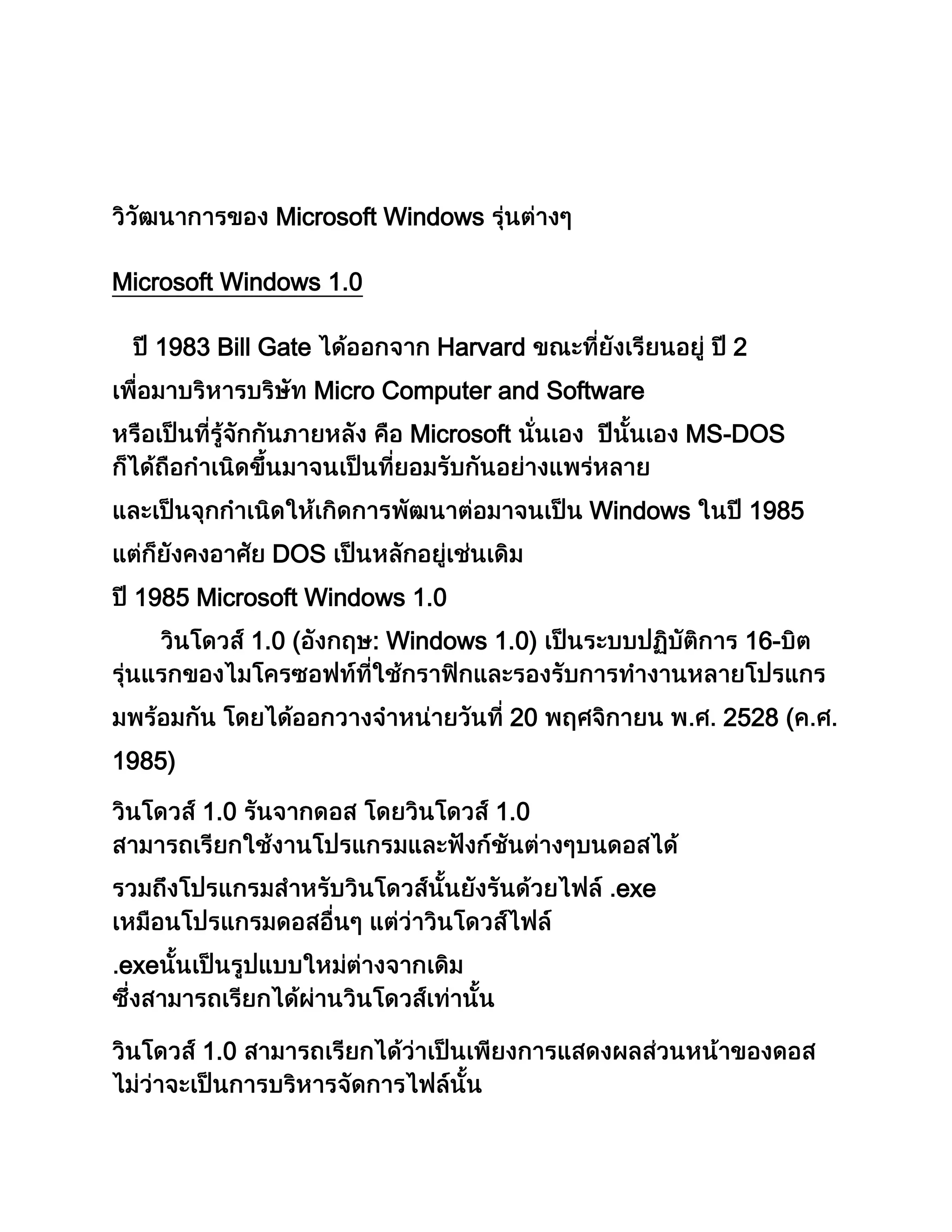 This document provides a brief history of Microsoft Windows operating systems from version 1.0 in 1983 to Windows 8 in 2012. It describes the key features and changes introduced in each new version, including the introduction of the graphical user interface in Windows 2.0 and 3.0, the addition of networking capabilities in Windows for Workgroups 3.1, the transition to a 32-bit architecture in Windows NT 3.1, and the introduction of the Start menu and taskbar in Windows 95. It also discusses new versions such as Windows XP, Windows Vista, Windows 7 and the touch-friendly modern UI in Windows 8.