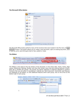 The document provides an overview of the key features and functions in Microsoft Word 2007, including: