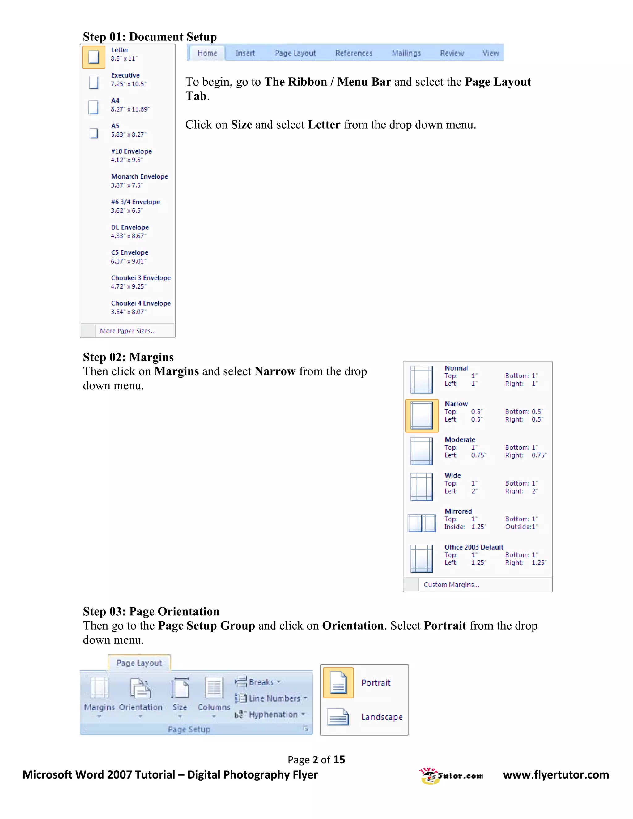 This document provides step-by-step instructions for creating a simple flyer in Microsoft Word, including inserting rectangles and text boxes, formatting fonts and colors, adding images and other shapes. The 31 steps cover topics like setting up document properties, adding filled rectangles, centering and styling text, changing transparency and more to design the flyer layout.