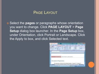 Microsoft Word is a graphical word processing program used for creating and saving documents, offering tools for page layout, citations, mailings, and management of content. It includes multiple tabs such as Home, Insert, and View, each providing relevant commands to modify text, insert graphics, and manage document settings. Features like bookmarks, hyperlinks, formatting options, and shortcuts enhance user experience and efficiency while working with documents.