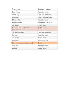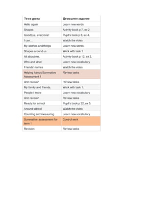 This document contains a list of lesson topics, homework assignments, and activities for students. It includes lessons on shapes, clothes, family and friends, school, places in the world, and story time. For each item, students are instructed to complete exercises from their activity book or pupil's book, learn new vocabulary words, watch related videos, or review previous tasks. The document also references three summative assessments to be completed at the end of terms 1 and 2.