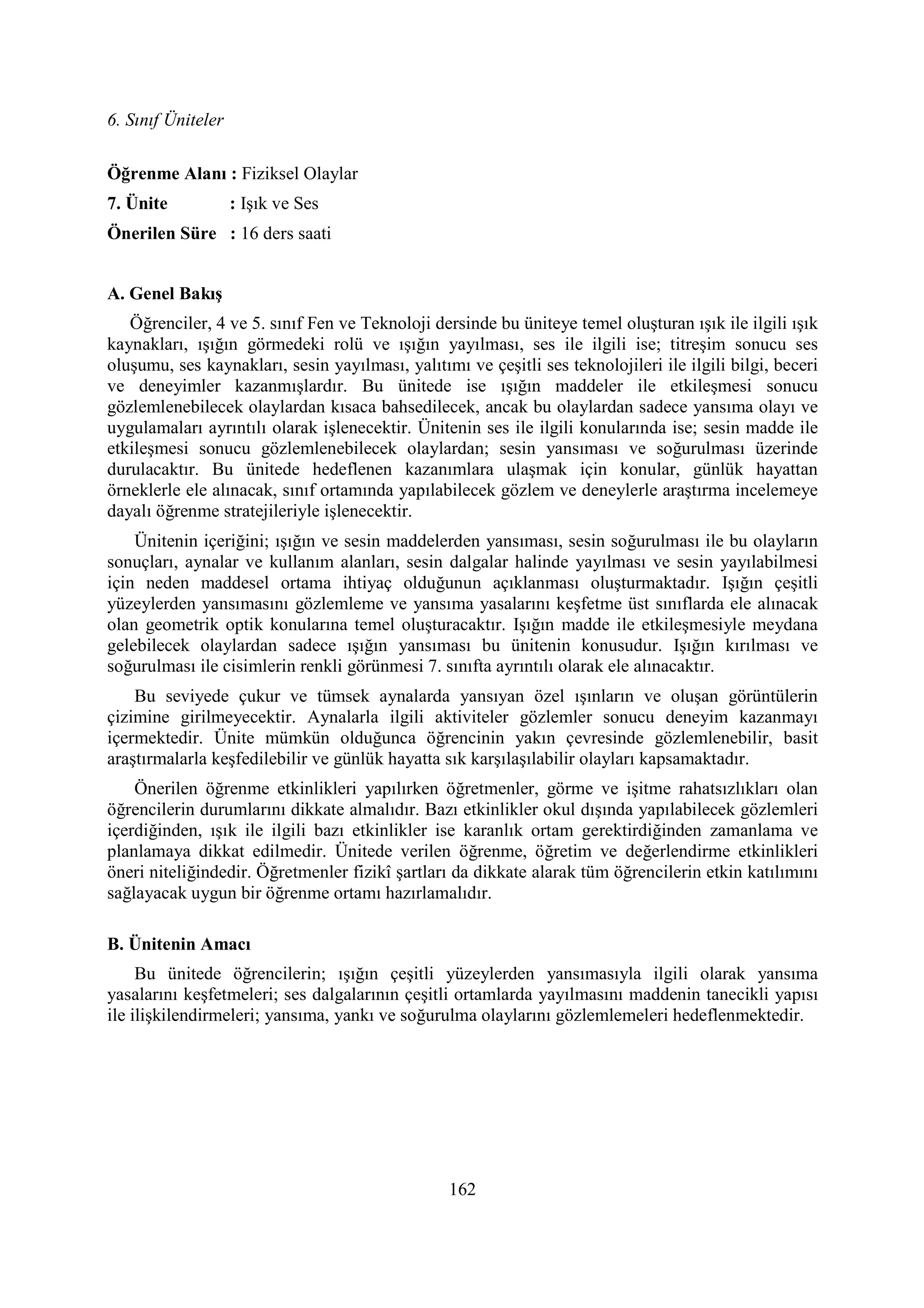 Ünitenin içeriğini; ışığın ve sesin maddelerden yansıması, sesin soğurulması ile bu olayların
