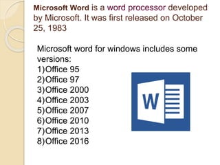 This document provides an overview of Microsoft Word, including its history and key features. It was first released in 1983 and has since had several updated versions. The main tabs described are File, Home, Insert, Page Layout, References, Mailing, Review, and View. The Home tab contains formatting tools and is one of the most used. The Insert tab allows adding items like page numbers and pictures. The Review tab facilitates checking spelling, researching words, and leaving comments. The View tab allows changing between document layout views.