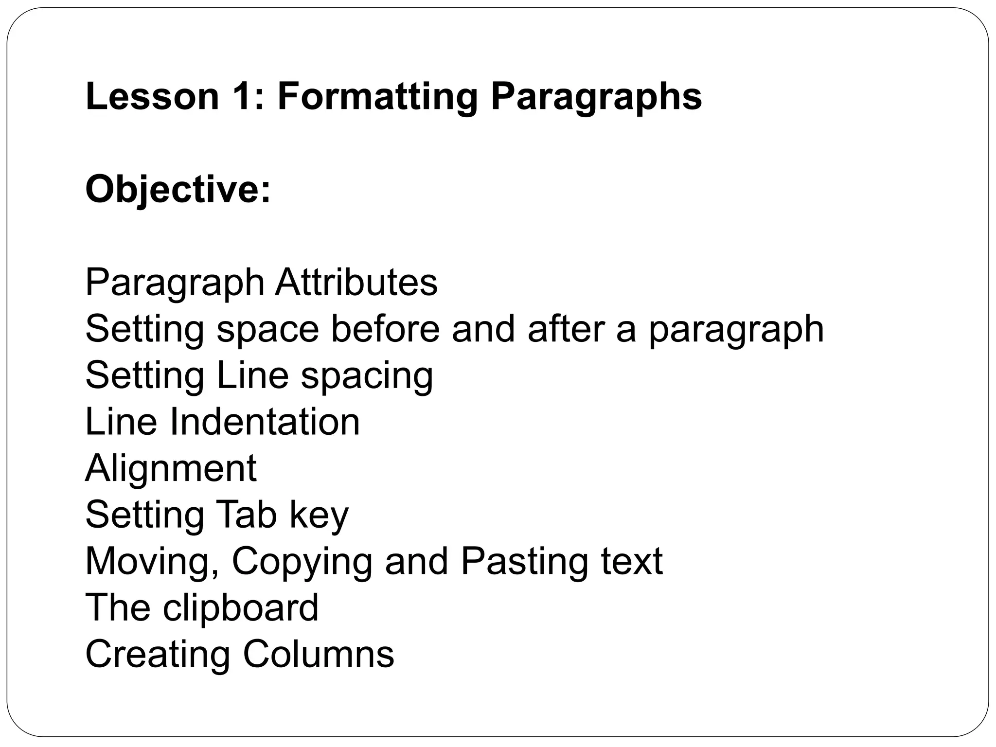 The document provides instructions on formatting paragraphs in Microsoft Word. It discusses setting spacing before and after paragraphs, line spacing, indentation, alignment, and tabs. It also covers moving, copying, and pasting text using the clipboard. The document provides exercises for applying these formatting options to paragraphs.
