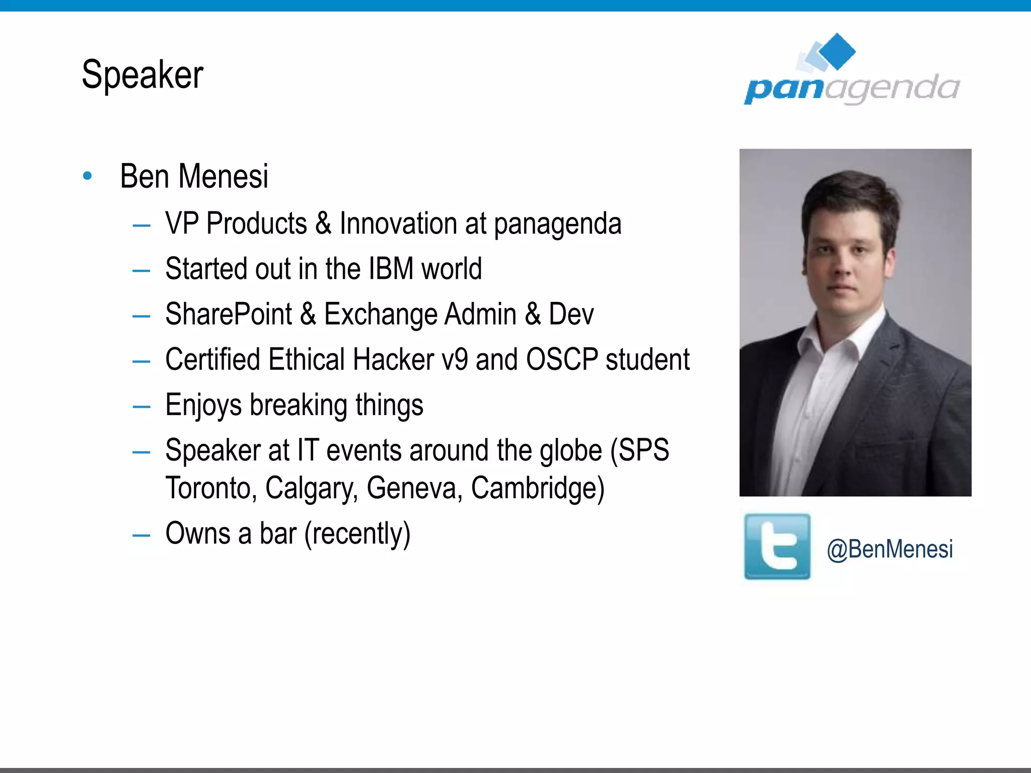 The document details a presentation by Ben Menesi on Office 365 security from a hacker's perspective, highlighting real-life threats such as ransomware, phishing, and brute force attacks. It discusses various tactics for protecting data, including multi-factor authentication, email encryption, and the importance of monitoring and controlling application permissions. Additionally, it emphasizes the need for effective security practices and user education to mitigate risks associated with cloud services and cyber threats.