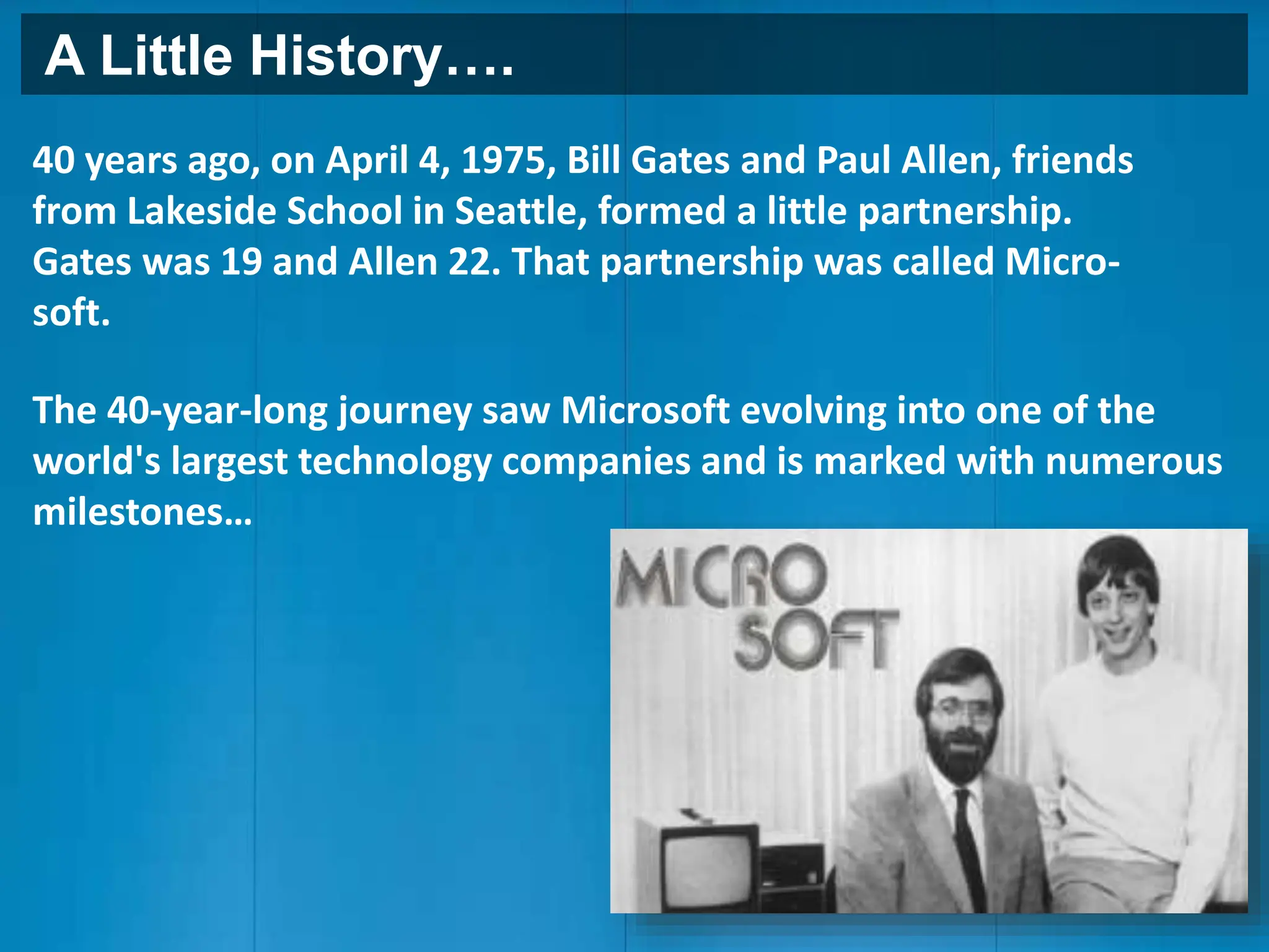 On April 4, 1975, Bill Gates and Paul Allen formed Microsoft as a small partnership in Seattle. Over the past 40 years, Microsoft has evolved into one of the world's largest technology companies, known for software such as the Microsoft Office suite, which includes Word for documents, Excel for spreadsheets, PowerPoint for presentations, and Outlook for email. The document then provides information about the features and uses of these Microsoft Office applications.