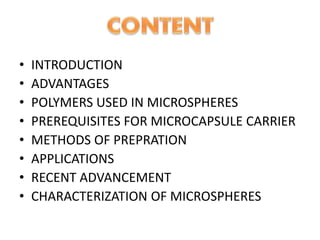 This document summarizes microspheres, which are spherical particles smaller than 200 microns made of biodegradable polymers or proteins. Microspheres can be used to deliver drugs in a controlled manner and provide benefits like taste masking and protection from environmental degradation. Common methods for preparing microspheres include single/double emulsion and polymerization techniques. Microspheres find applications in drug delivery, vaccines, and imaging and are characterized based on properties like size, morphology, drug release kinetics, and thermal behavior. Recent research involves development of targeted and sustained release microsphere formulations.