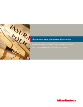 This document discusses how business intelligence solutions from MicroStrategy can help insurance companies maximize profits from policyholders. It outlines some typical problems insurance companies face, such as having few customer touchpoints after the initial sale and fragmented customer data sources. MicroStrategy's BI platform can consolidate customer data from different systems to create a single view of each customer. With insights into customer behavior trends and patterns, insurance companies can develop targeted strategies to cross-sell additional products, improve customer retention, and generate new revenue opportunities.