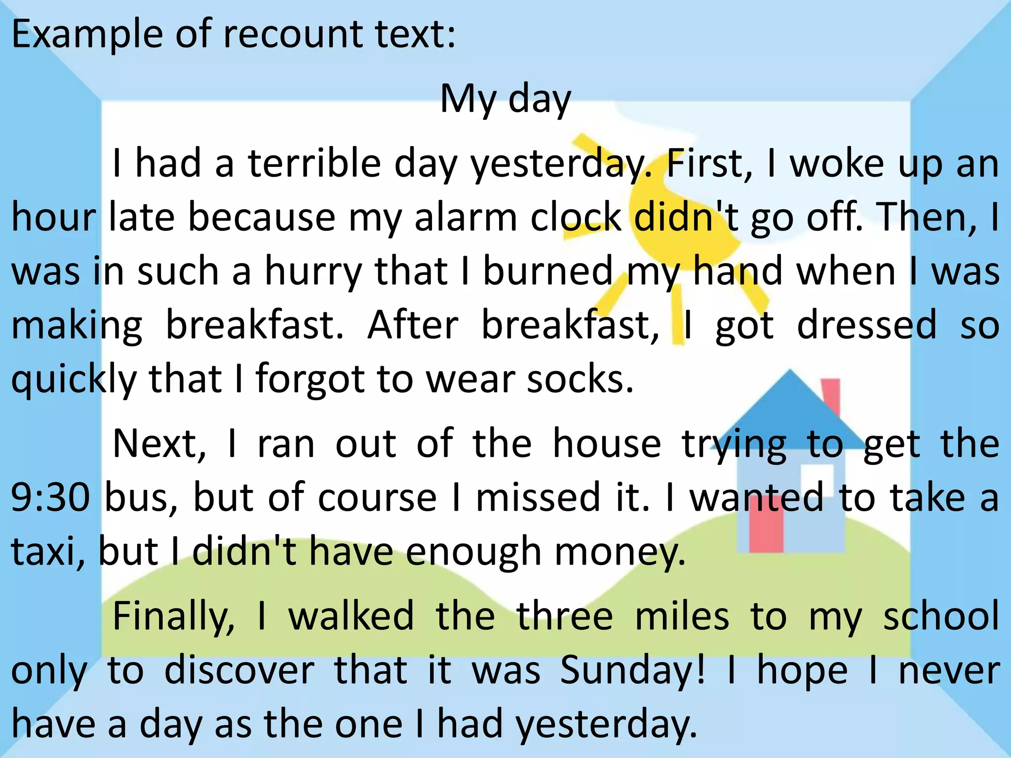 The document recounts a terrible day that the writer had. They woke up late because their alarm clock didn't go off. They then burned their hand while rushing to make breakfast and forgot to wear socks while getting dressed. The writer missed their bus and didn't have enough money for a taxi, so they walked 3 miles to school only to discover it was Sunday.