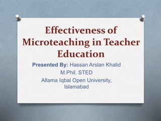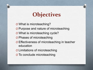 Microteaching is a method used to train teachers that involves teaching short lessons to small groups of students. It allows teachers to receive feedback to improve their skills. The document discusses the purpose and process of microteaching, which involves planning, teaching, receiving feedback, and reteaching lessons. It also outlines the effectiveness of microteaching, such as improving teachers' skills, and its limitations, such as requiring resources and creating artificial environments. Overall, microteaching provides opportunities for teachers to develop their teaching abilities through practicing lessons and receiving feedback.