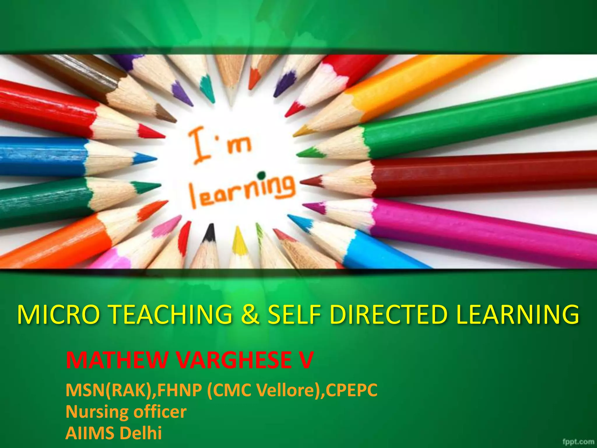 This document discusses microteaching and self-directed learning. It defines microteaching as a scaled down teaching session with 5-10 students over 5-20 minutes, focusing on developing one teaching skill at a time. The microteaching cycle involves planning, teaching, receiving feedback, and reteaching. Self-directed learning allows learners to take initiative for their own learning by identifying needs, goals, and resources without a teacher. It uses modules with objectives, learning activities, and assessments. Both microteaching and self-directed learning aim to help teachers and learners respectively improve their skills through practice and feedback in a structured way.