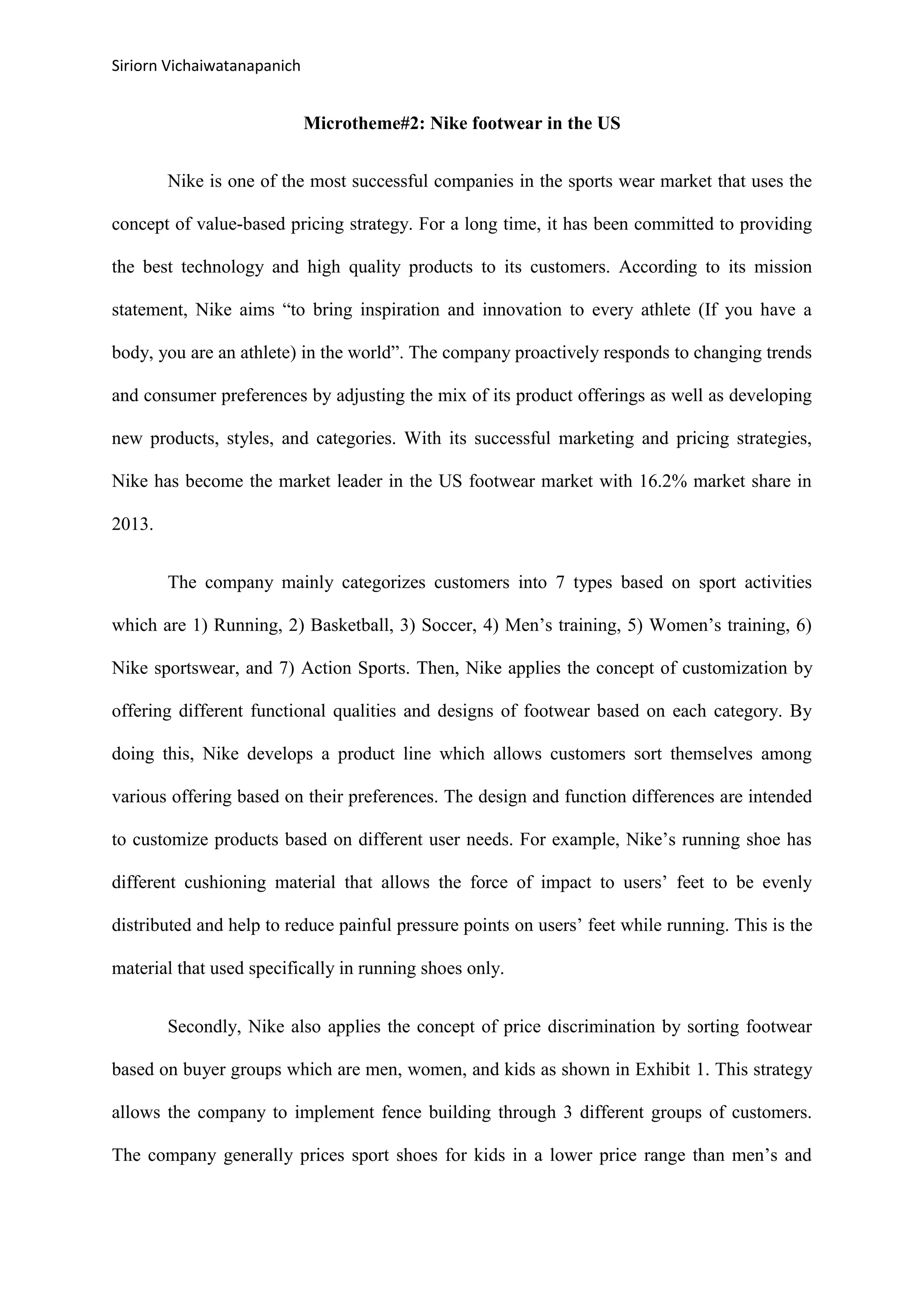 Nike is the market leader in the US footwear market, holding a 16.2% market share in 2013. It successfully segments customers and products, allowing it to price discriminate. Nike also outsources manufacturing to lower costs while maintaining quality. Through innovation, celebrity endorsements, and responsive strategies, Nike is able to charge premium prices and follow a price leadership approach over competitors like Adidas.
