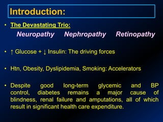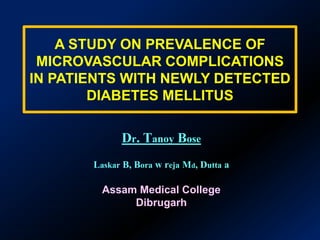 This study examined the prevalence of microvascular complications in 90 newly diagnosed diabetes patients in Assam, India over one year. The most common complication was distal symmetrical sensory neuropathy (56.66%), followed by nephropathy (36.66%) and retinopathy (20%). Neuropathy was also the most common isolated complication (23.33%). Comorbidities like hypertension and higher BMI significantly increased the prevalence of microvascular complications. The study concludes that microvascular complications are already significantly prevalent at the time of initial diabetes diagnosis, so early detection and management of risk factors like comorbidities are important for control.