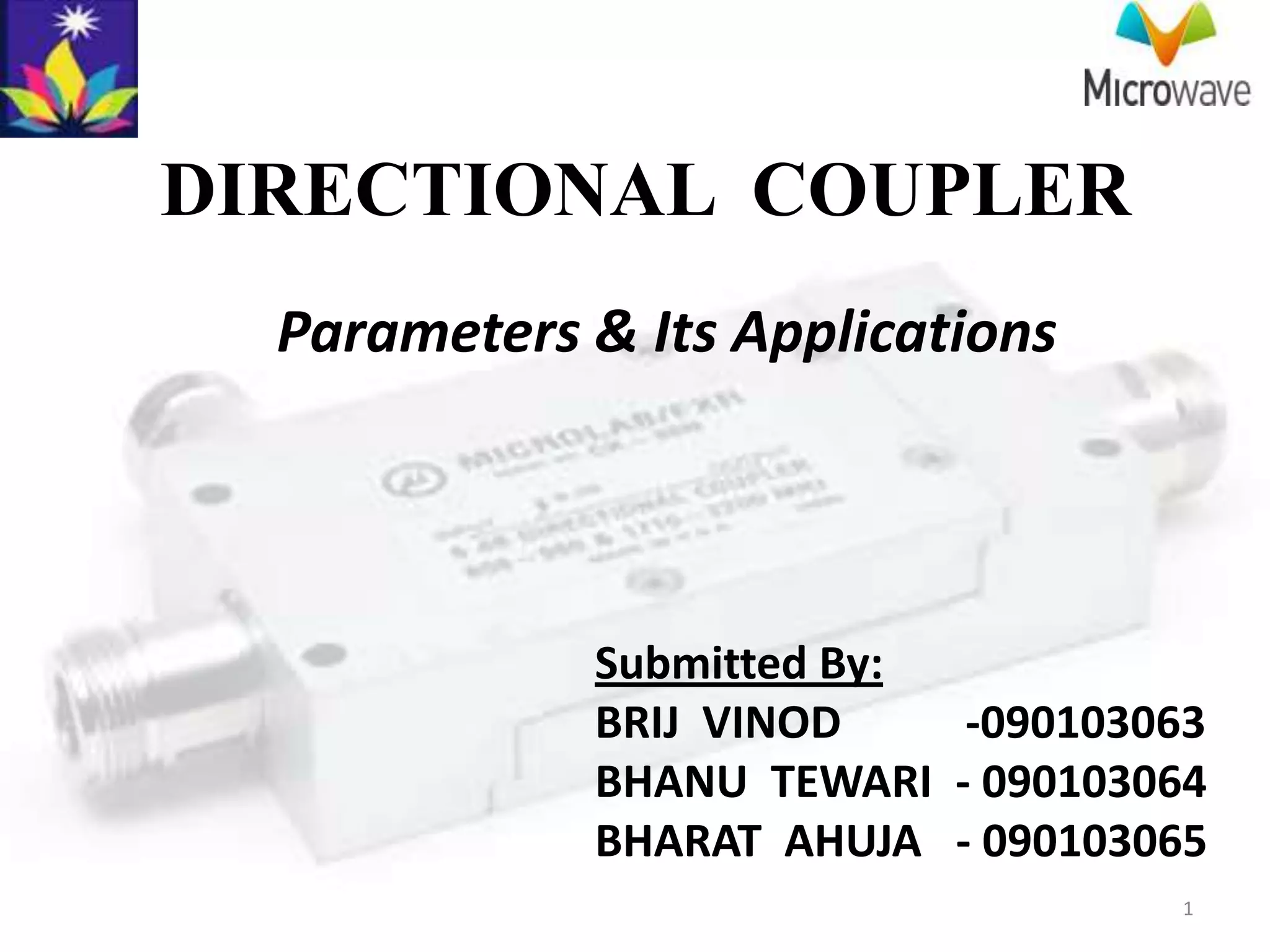 A directional coupler is a passive device that couples part of the transmission power from one transmission line to another. It has four ports: input, transmitted, coupled, and isolated. Key parameters are coupling factor, loss, isolation, and directivity. Directional couplers are commonly used to monitor power and frequency without interrupting the main signal, for frequency and power measurements, and combining signals to a receiver when isolation is high.