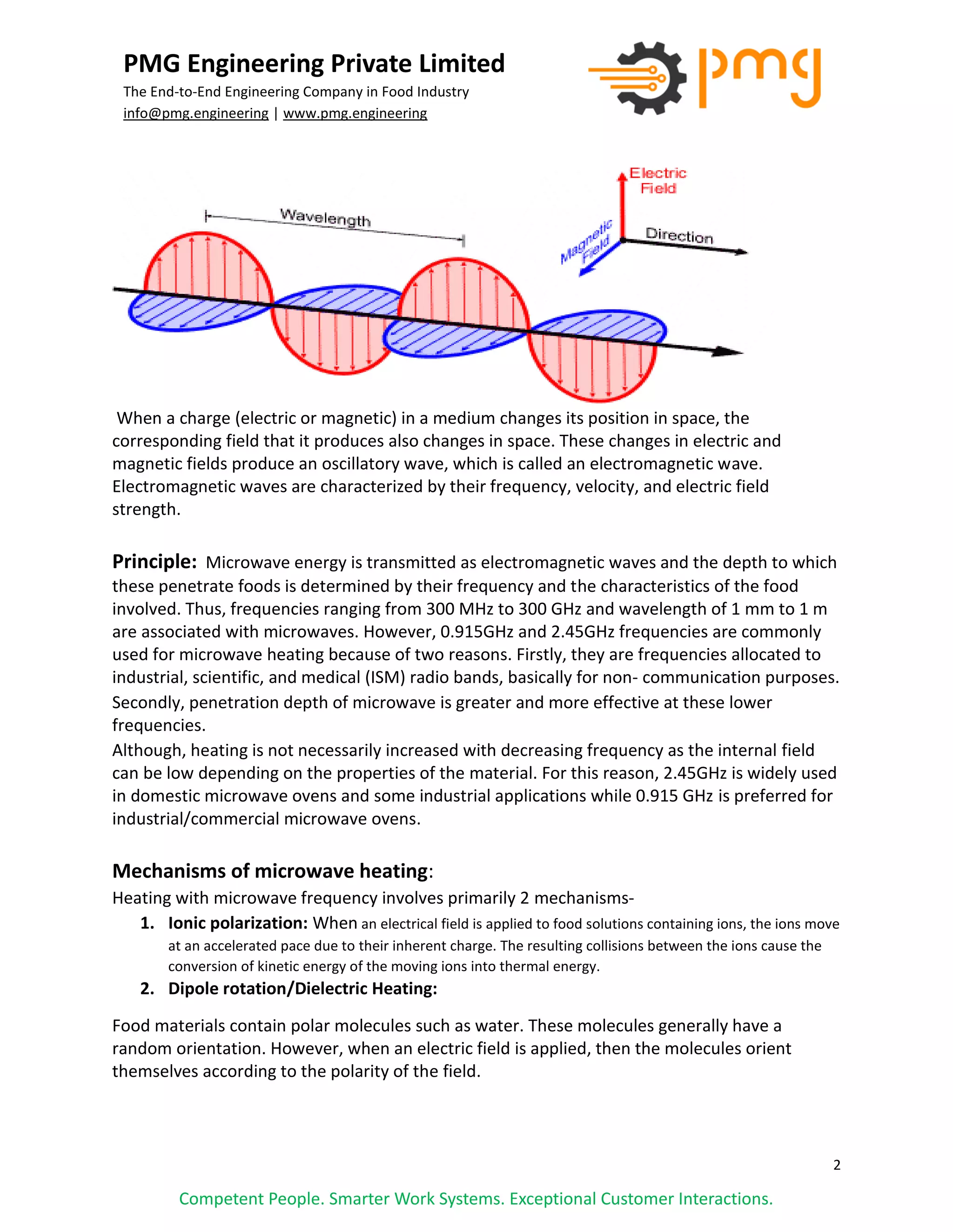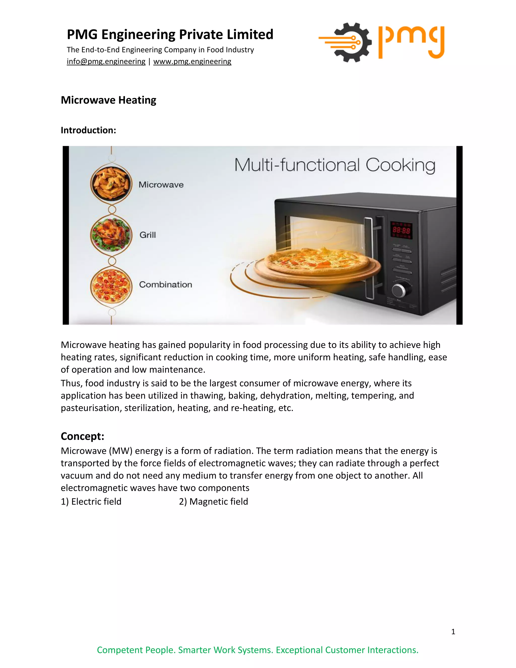 PME Engineering explores the application of microwave heating in the food industry, highlighting its benefits such as reduced cooking times and uniform heating. Microwave energy, transmitted as electromagnetic waves, effectively penetrates food at specific frequencies to generate heat through ionic polarization and dipole rotation. The document explains the functionality of microwave ovens, including the role of the magnetron in generating high-powered radio waves that agitate food molecules for effective cooking.