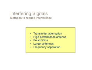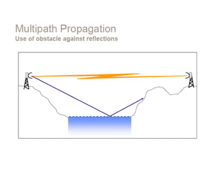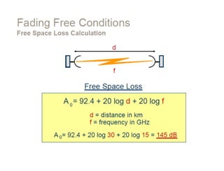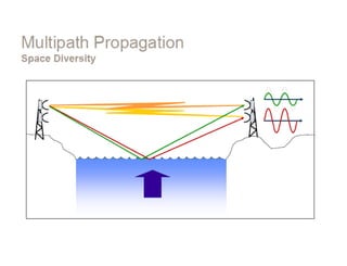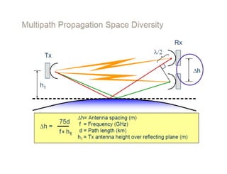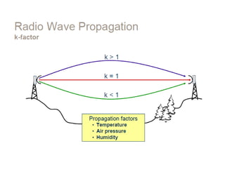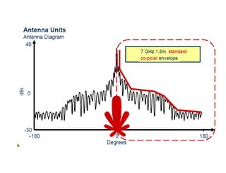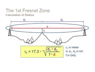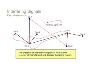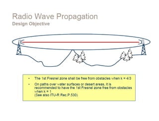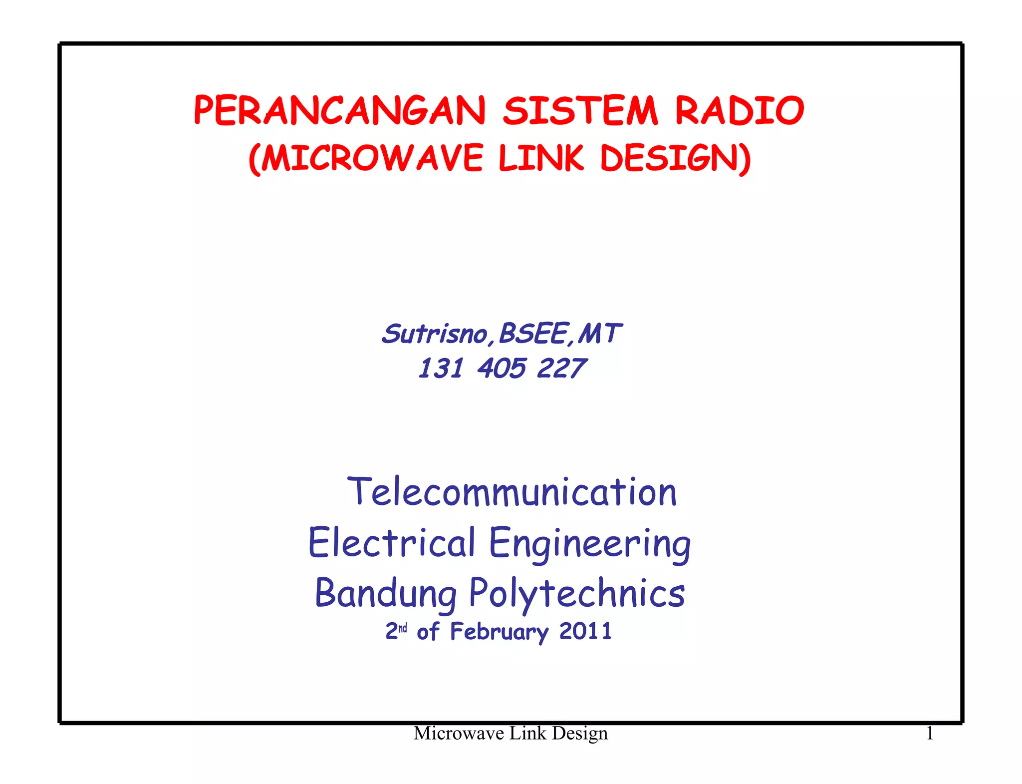 Dokumen ini membahas desain sistem komunikasi microwave, menjelaskan frekuensi yang digunakan, keuntungan, dan berbagai pertimbangan teknis seperti garis pandang (LOS) dan perhitungan rugi-rugi. Proses desain melibatkan analisis kompleks tentang propagasi sinyal, interferensi, dan fading untuk memastikan kualitas dan ketersediaan. Juga dibahas penentuan anggaran link yang mencakup faktor keuntungan dan kerugian yang mempengaruhi jarak operasional antara pemancar dan penerima.