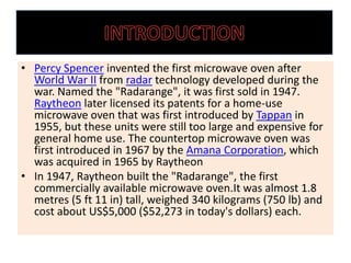 Percy Spencer invented the microwave oven in 1947 based on radar technology developed during World War II. The first microwave oven, called the Radarange, was large and expensive, selling for around $5000 each. Later home microwave ovens were introduced in the 1950s but were also still too large and expensive for general use. The countertop microwave oven that was smaller and more affordable was first introduced in 1967. Microwave ovens work by emitting microwave radiation that causes polarized molecules in food to rotate and generate heat through dielectric heating. They are popular for quickly reheating and cooking foods.
