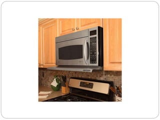 A microwave range hood is a kitchen appliance that combines a microwave oven and range hood into a single unit to save space. It allows the microwave to be installed above the cooktop instead of taking up counter space. Microwaves work by using electromagnetic waves to vibrate water molecules in food, generating heat. Key components include the magnetron which generates the microwaves, waveguide which directs them, and the cooking cavity which contains the microwaves for safe cooking. Microwave range hoods provide a space-saving option for kitchens with limited counter space.