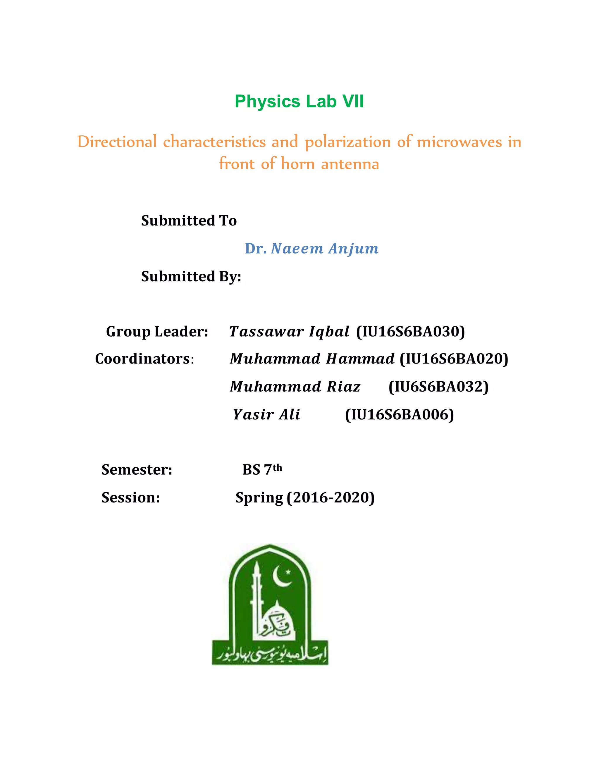 This document describes a physics lab experiment on microwaves. The experiment studied the directional characteristics and polarization of microwaves emitted from a horn antenna. Key aspects covered include: