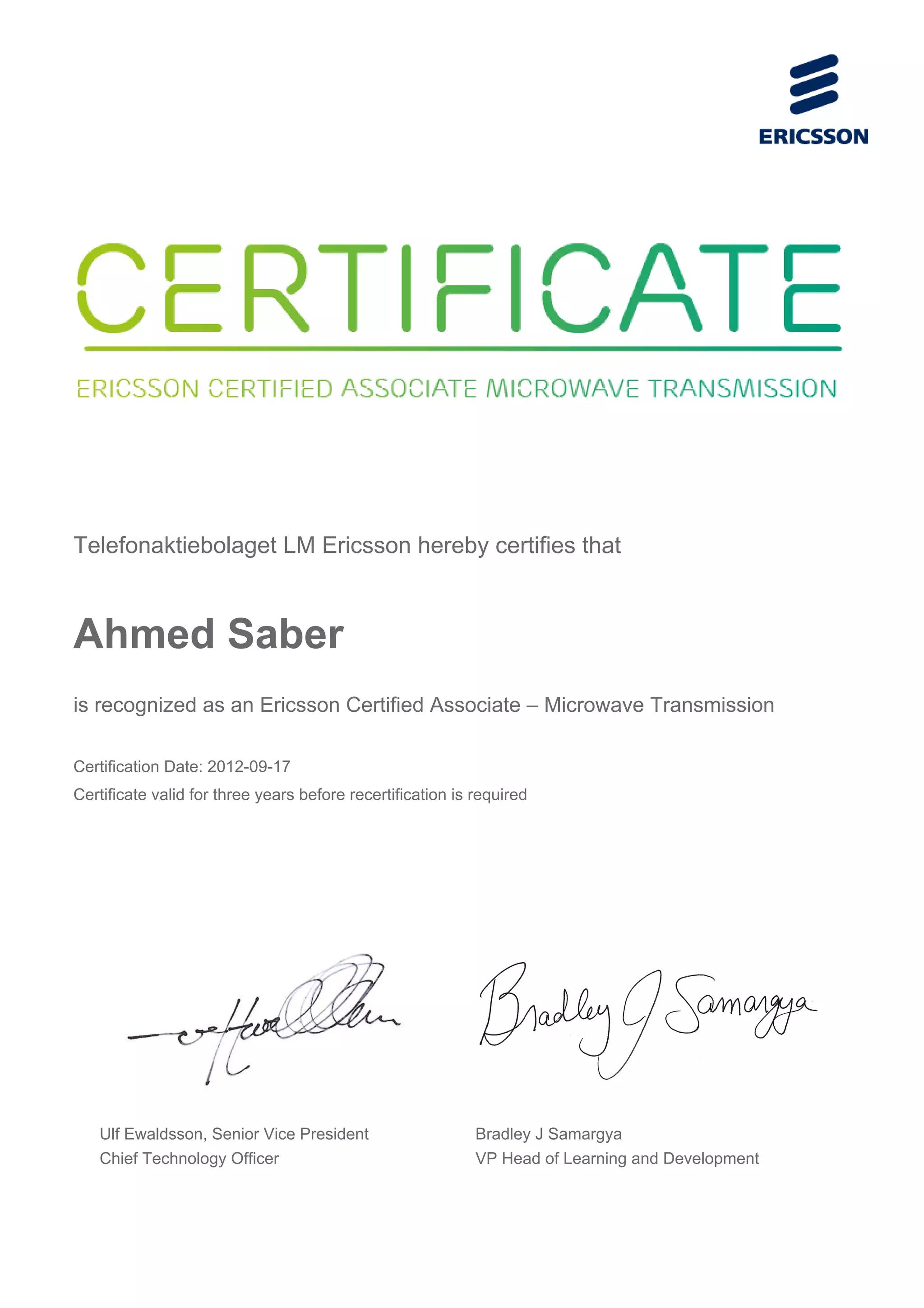 Ahmed Saber was certified as an Ericsson Certified Associate – Microwave Transmission on September 17, 2012 according to a certificate issued by Telefonaktiebolaget LM Ericsson. The certificate is valid for three years before recertification is required and was signed by Ulf Ewaldsson, Senior Vice President and Chief Technology Officer, and Bradley J Samargya, VP Head of Learning and Development.