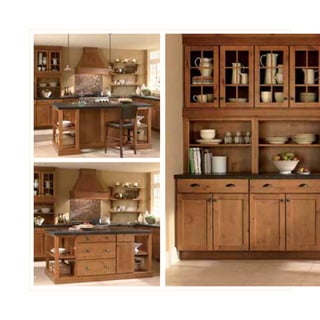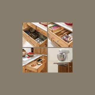 The document discusses kitchen cabinetry and built-in furniture options for homes. It provides details on various wood species, finishes, door styles and functional design considerations. The goal is to create beautiful, well-designed and high-quality cabinetry that is tailored to customers' tastes and needs. Cabinets are designed to maximize storage and organization throughout the kitchen and other areas of the home. Functionality, aesthetics and durability are priorities.