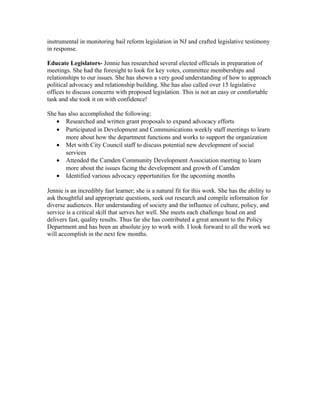 Jennifer Pilong completed a sociology internship at Volunteers of America Delaware Valley where she worked on several policy and advocacy projects. She drafted an internal policy agenda, supported the Give.Voice. advocacy program, monitored relevant laws and policies, and educated legislators. Pilong researched issues like housing, healthcare, and criminal justice to inform the policy agenda. She also drafted advocacy alerts, participated in meetings, and identified future opportunities to expand advocacy efforts. Her supervisor praised Pilong as a natural fit for the work who is thoughtful, fast learning, and delivers quality results.
