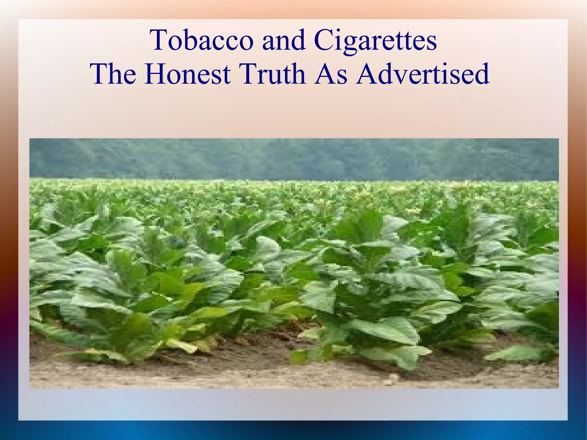 This document discusses the history of tobacco and cigarette advertising in the United States. It covers how packaging and advertising strategies changed over time, becoming more visually appealing. Cigarette consumption peaked in the late 1950s and 1960s as advertising techniques targeted more consumers. The document references images and statistics from the Centers for Disease Control and Prevention on the economics of tobacco production and use.