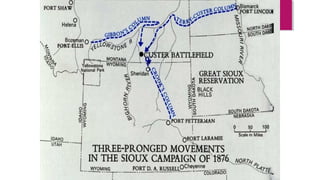 General Custer and 268 of his troops were killed at the Battle of Little Bighorn in 1876 in a major defeat by Native American forces led by Sitting Bull and Crazy Horse. Westward expansion in the 19th century was driven by gold miners, farmers, Chinese laborers, and European immigrants. The development of the West was also impacted by several key laws and events, including the Homestead Act of 1862 which gave settlers land, the Transcontinental Railroad which connected the country, and the invention of barbed wire which enabled the enclosure of open ranges.